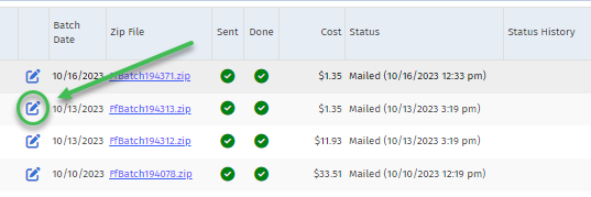 Fail - the batch was not received by fulfillment due to an error in the data (for example an incomplete mailing address). After correcting the data, the batch can be re-sent by clicking the Edit icon and clicking the ReSend button.