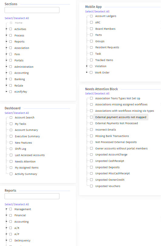 Sections- This area controls which pages, tabs, and functions this Profile will have access to.