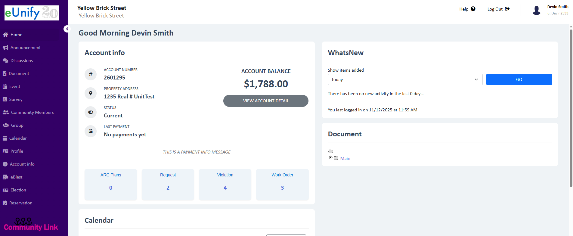 Once homeowners are logged in, they can begin viewing the Community tabs and activities in the site. Please note, these features are enabled by the Administrators and some may not be available unless first granted.