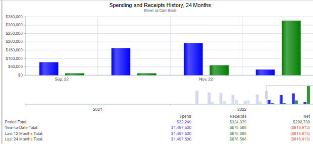 Bar Chart- This section displays total spending vs. receipts for the past six months for a quick cash flow analysis. Expenses are shown in blue and receipts are shown in green.