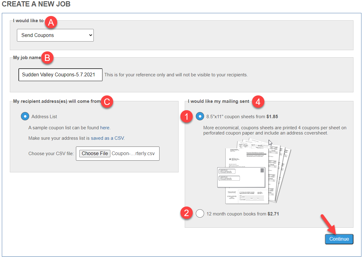 I would like my mailing sent - Select the 8.5"x11" coupon sheets - 4 coupons per sheet option.