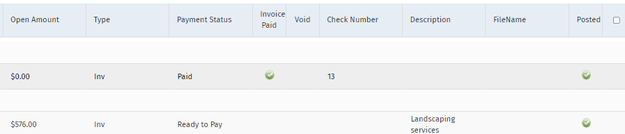Check Number- If the Invoice has been paid, the check number will appear in this column.