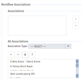 Use this Tab to assign Associations to this workflow. To assign all, select the double up arrow, to assign a single Association, highlight the name and select the single up arrow.