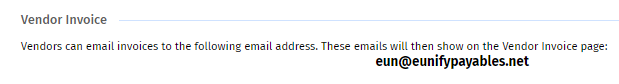 Integration Tab- Vendor Invoice Section - Use this section to locate the email to be used for Vendor invoices. If no email address is provided, please submit a ticket and we will assign one for you.