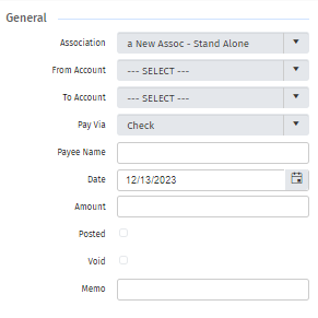 Check- Selecting this option will initiate a check payable to the receiving account. Enter the name of the receiving account in a Payee Name field below.