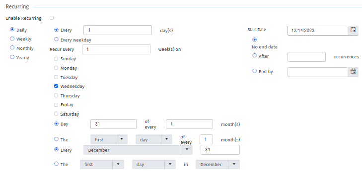 Recurring Tab - Complete the fields necessary to schedule recurrence as needed.