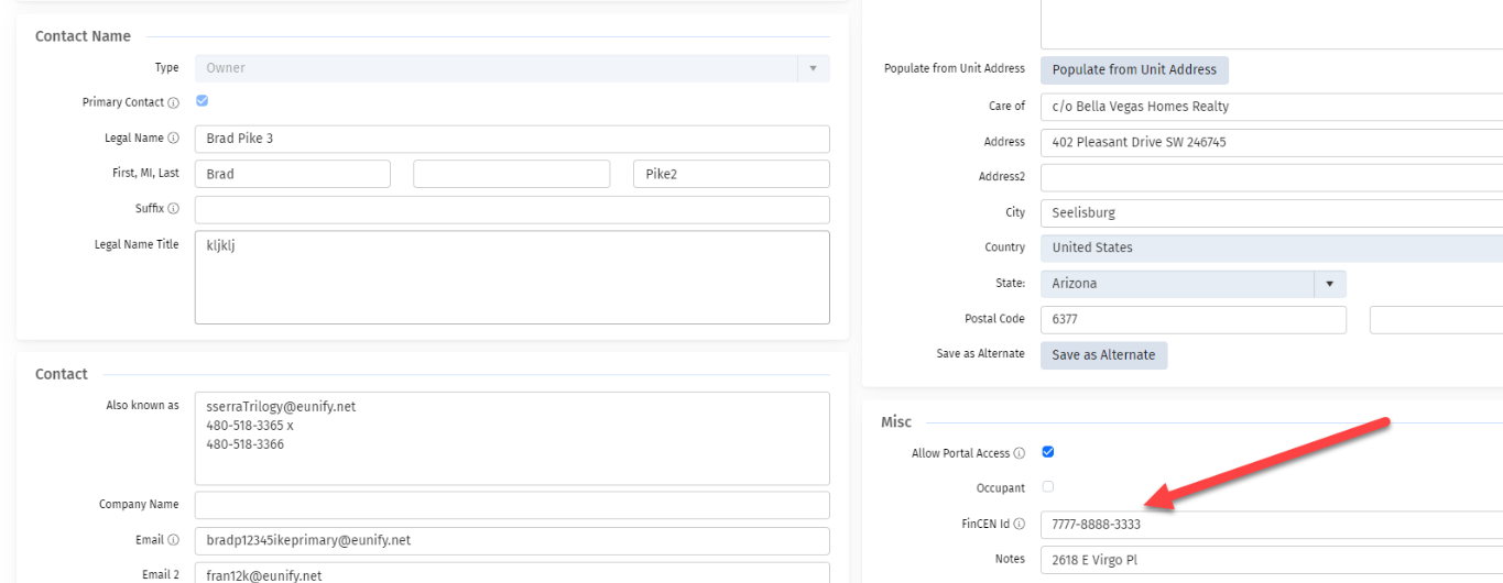 Edit into the contact page and locate the Misc section. From here you can enter the 12 digit FinCEN ID number.