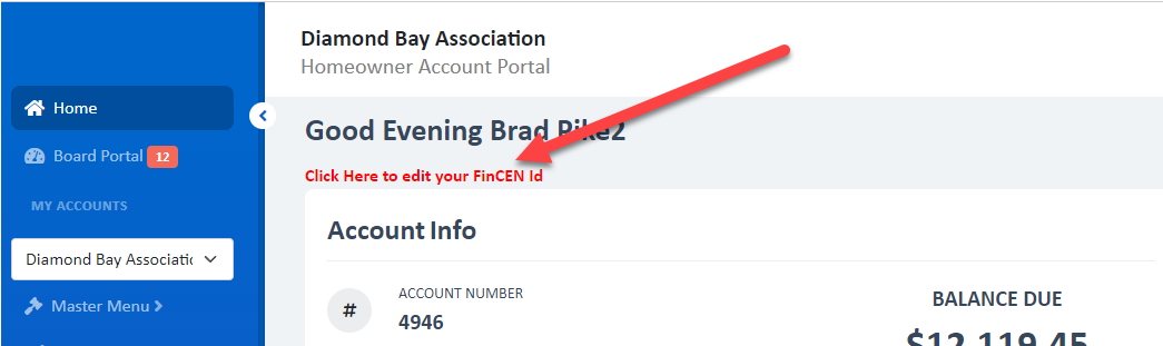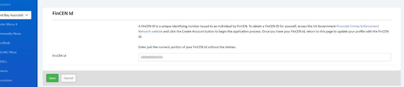 eUnify Board members have the ability to update their own FinCEN ID directly on the portal. Board members receive a reminder on the home page if they need to provide their FinCEN Id and can also access the FinCEN ID directly from the My Profile page.
